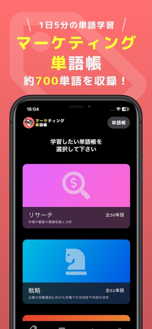 また、マーケティング業界でよく使われる専門用語が中心なので、使っていくうちにビジネスの場でも活かせる知識が身に付きます。マーケティングの勉強に時間が取れない方でも、電車やバスでの移動中に手軽に活用できるのが魅力です。