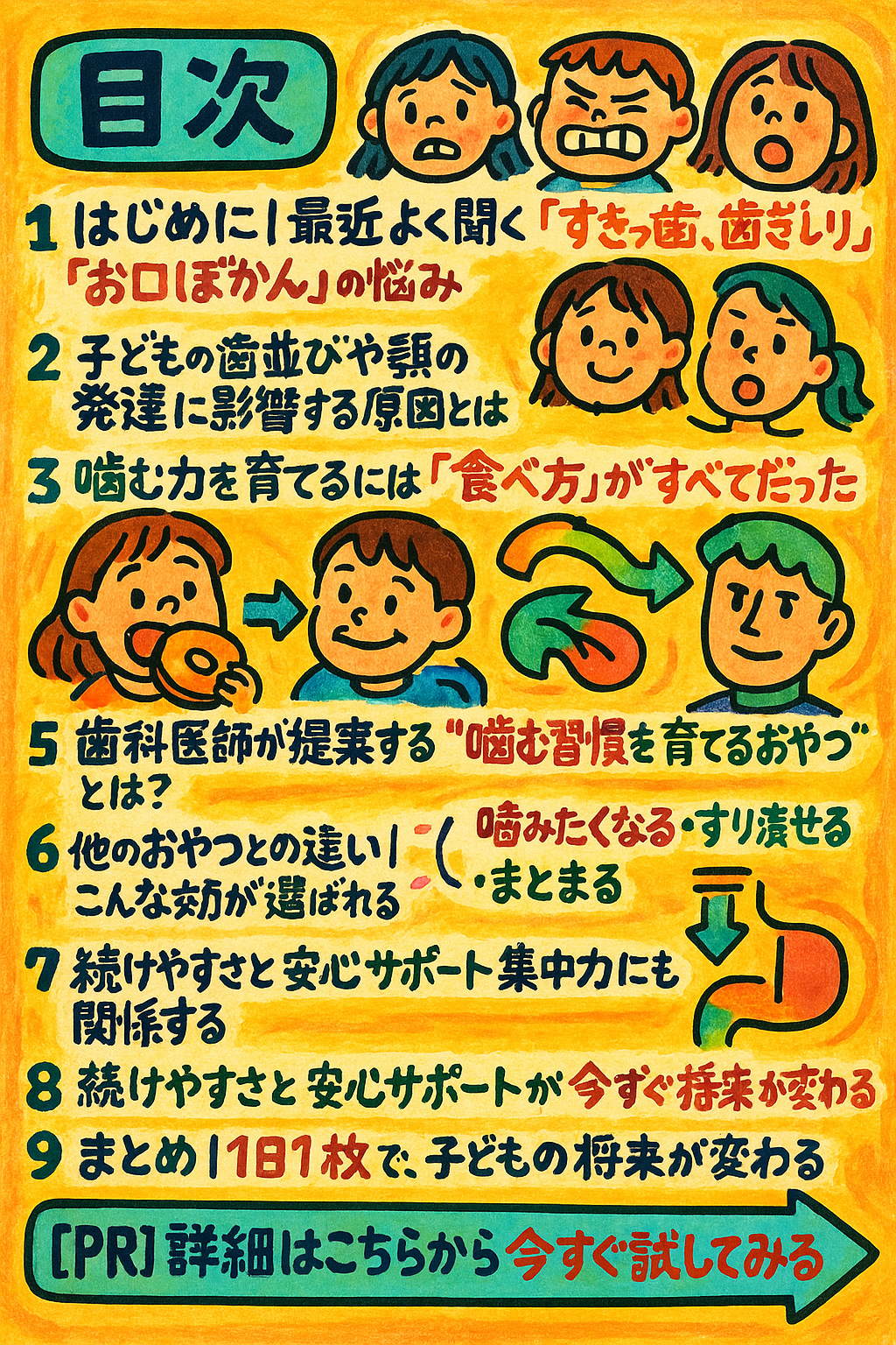 【目次】 はじめに|最近よく聞く「すきっ歯」「歯ぎしり」「お口ぽかん」の悩み 子どもの歯並びや顎の発達に影響す … 続きを読む 【子どもの歯並び・顎の成長が心配な方へ】噛む力を育てる“あるおやつ”で未来の笑顔を守ろう